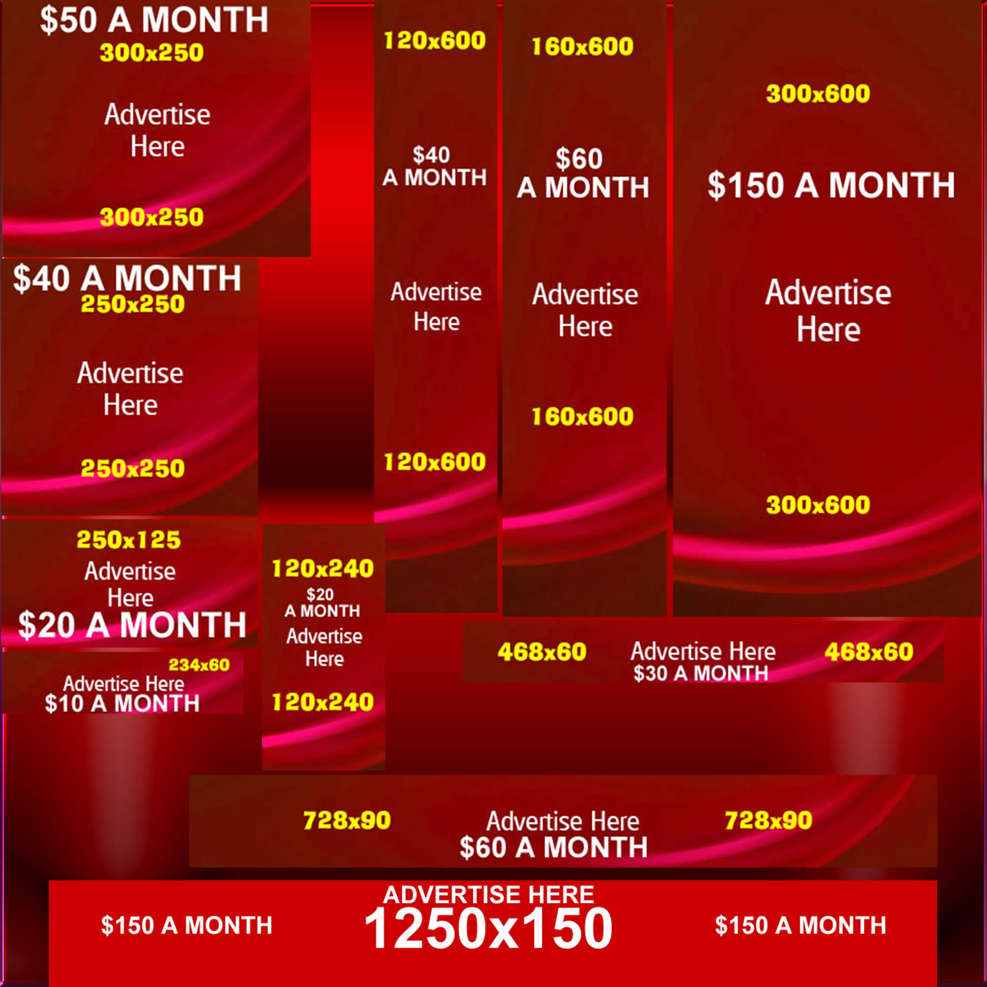 Banner advertising is a monthly fee unless paid for by the year. see our prices below on the banner size images. Please note that this is a responsive website. That means that your banner could be resized a little. It could either go smaller or larger depending on The View of the monitor that's visiting this website. Have any questions on any Banner ad or would like to sign up please Contact Us today. We also have the 1250x150 banner too.